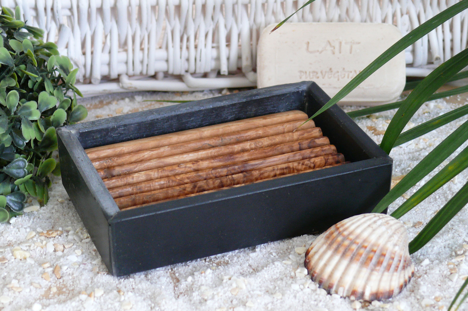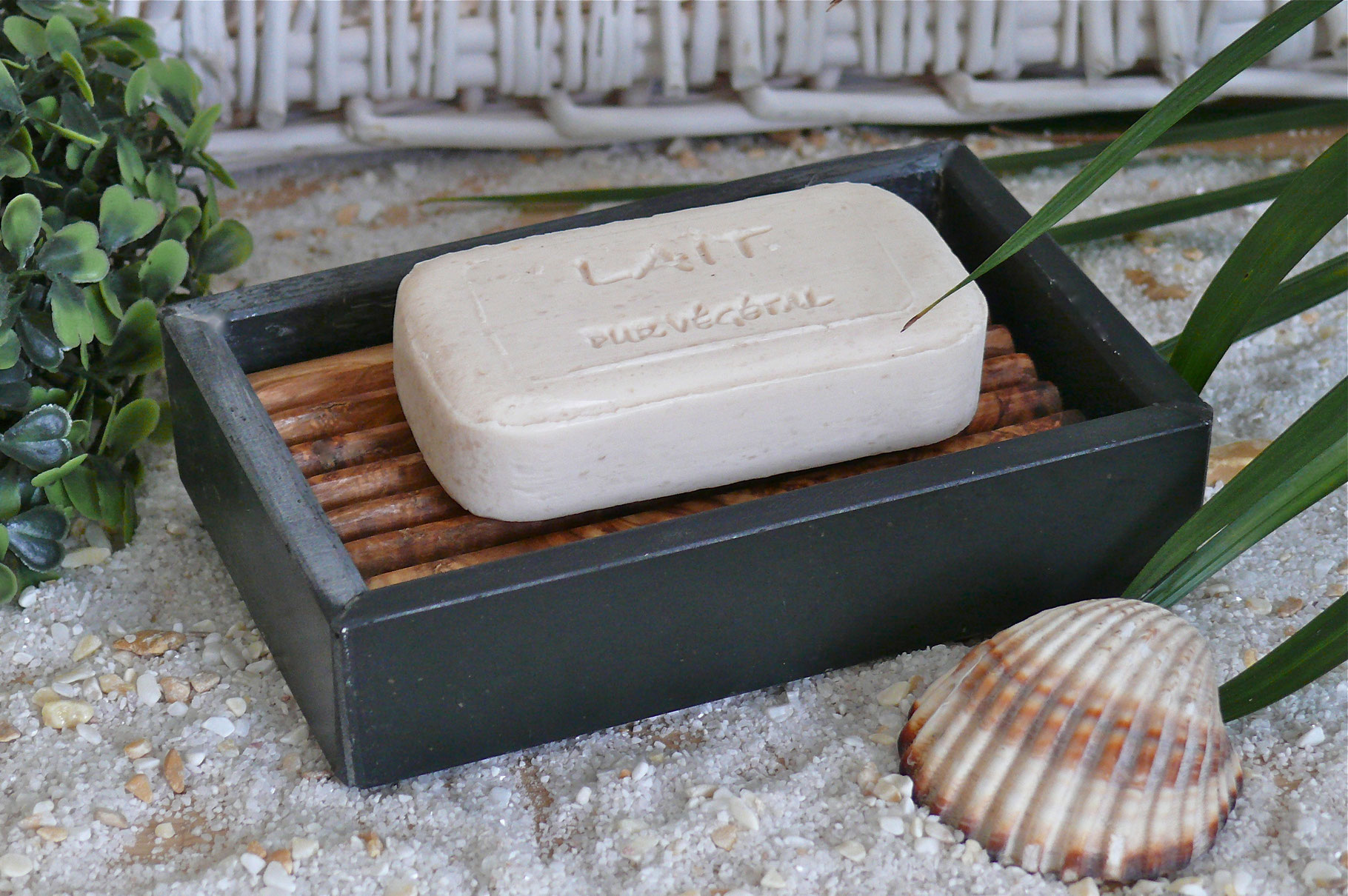 Seifenschale aus Schiefer mit RillenInlay aus Olivenholz.
