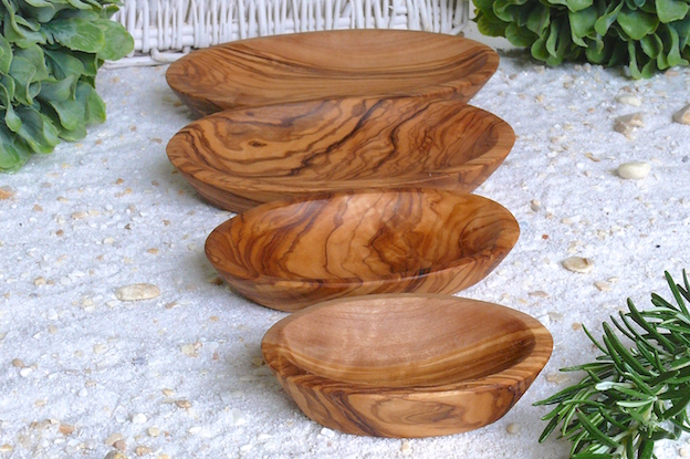 Vier kleine Schalen zum Servieren von Dips, Oliven, Nüssen und vieles mehr. Da Olivenholz eine sehr hohe Dichte hat, dringen Fette nicht in das Holz ein und können einfach unter fließend Wasser abgewaschen werden.